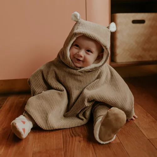 Enveloppez votre bébé dans un cocon de douceur avec notre poncho en velours côtelé taupe doublé teddy. Confortable, pratique et résolument chic, c’est l’allié parfait pour les sorties d’hiver, les balades ou les trajets en voiture. Un incontournable de la garde-robe bébé !