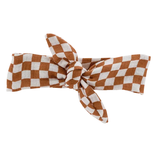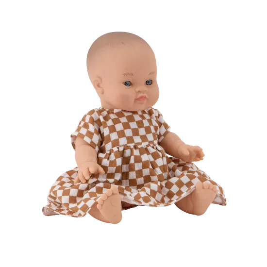 Poupée fille avec sa robe en damier marron de la marque Atelier Wagram