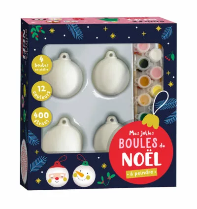Contenu : 4 boules de Noël en plâtre, 12 pots de peinture, 2 pinceaux en bois, 10 cartes à colorier, 400+ strass autocollants.