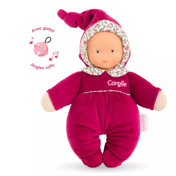 Le doudou Babidoux Rose Grenadine a la peau blanche et des yeux bleus peints. Il est habillé d’un pyjama et d’un bonnet en velours framboise tout doux avec un col “Claudine” en tissu fleuri. À l’intérieur de son bonnet est niché un grelot pour stimuler l’ouïe de bébé. De jolis détails fleuris ainsi qu’une broderie “Corolle” viennent sublimer ce Babidoux.