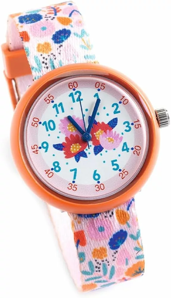 Découvrez la montre fleurs Ticlock de Djeco, une montre à quartz élégante avec de belles illustrations fleuries pour apprendre à lire l’heure.