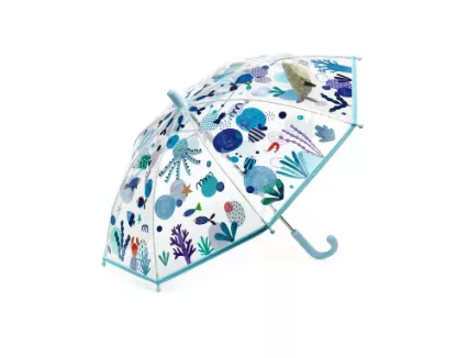 Découvrez le petit parapluie Mer de Djeco, un magnifique parapluie illustré en plastique transparent pour égayer les jours de pluie pour les enfants dès 3 ans. C’est parti pour une balade en mer sous la pluie!
