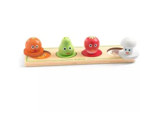 Découvrez le puzzle Vegi’n’Co de Djeco, un puzzle à encastrer en bois conçu pour les enfants dès 12 mois avec de jolis fruits et légumes : une tomate, une poire, une fraise et un champignon.