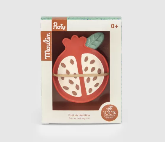 Offrez à votre bébé un jouet de dentition sain, naturel et ludique, idéal pour soulager les gencives tout en douceur avec le fruit de dentition Grenade – La Forêt Mawa