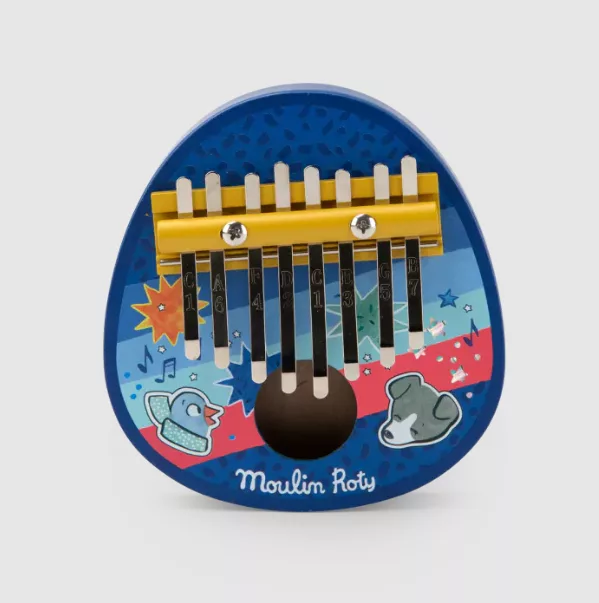 Kalimba en bois peint et lamelles métalliques, aux couleurs urbaines et vintage de Puce & Pilou. Cet instrument développe le rythme et l’éveil musical des tout-petits, avec des sons très doux.