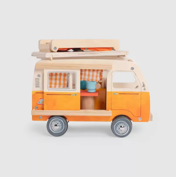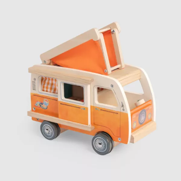 Tut tut ! Le van de la Grande Famille est prêt à partir sillonner le monde. Entièrement équipé, il comprend tous les essentiels du camping : table, banquette, ustensiles, tente de toit. Rien de mieux pour se mettre au vert en famille !