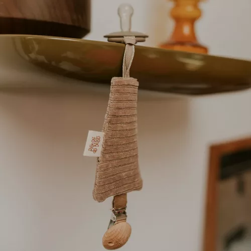 Craquez pour notre jolie attache tétine en velours taupe, une création artisanale pensée pour le quotidien des tout-petits (et de leurs parents !).